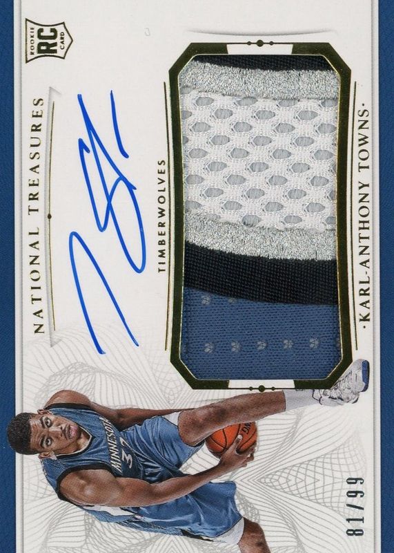 This card is 1 of 24 Karl-Anthony Towns' card variations in the 2015 National Treasures set being tracked by Sports Card Investor, including Base /99, Rookie Patch Auto - Silver /25, Rookie Patch Auto - Gold /10, Rookie Patch Auto - Emerald /5, and Rookie Patch Auto - Logoman /1.