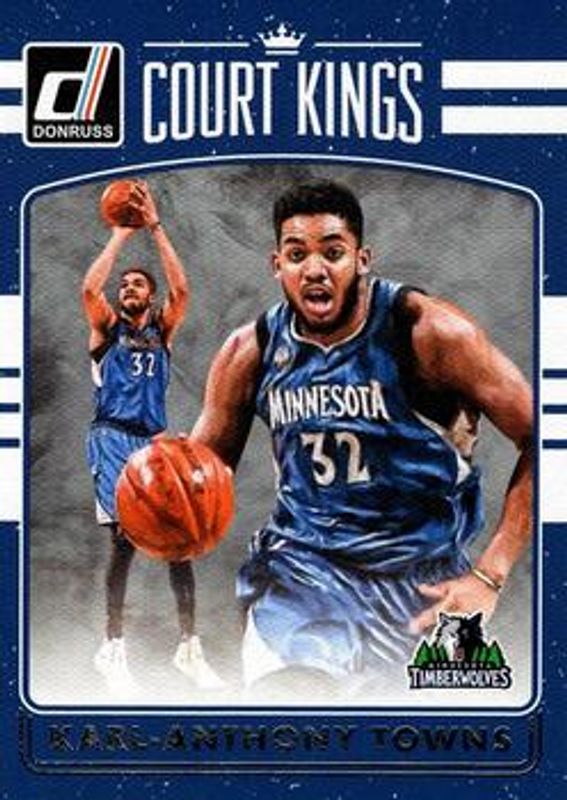 The Karl-Anthony Towns 2016 Donruss #15 Court Kings card is 1 of 39 Karl-Anthony Towns' card variations in the 2016 Donruss set being tracked by Sports Card Investor, including Base, Green & Yellow Holo Laser, Orange Holo Laser, Press Proof Silver /299, and Press Proof Purple /199.
