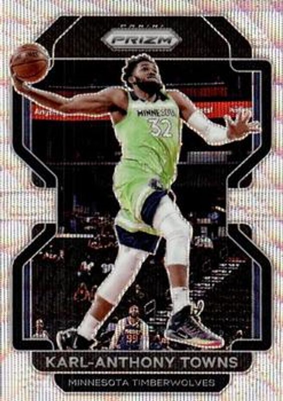 The Karl-Anthony Towns 2021 Prizm #157 Silver Wave card is 1 of 83 Karl-Anthony Towns' card variations in the 2021 Prizm set being tracked by Sports Card Investor, including Base, Blue NBA 75th Anniversary, Blue Wave, Choice Blue Yellow Green, and Factory Set Blue Hyper.