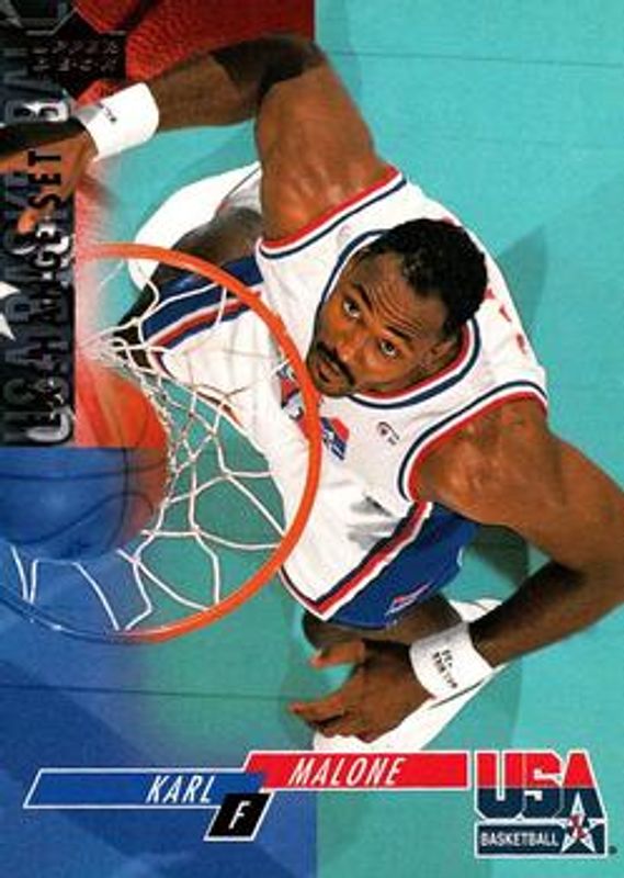 The Karl Malone 1993 Upper Deck Special Edition #USA7 USA Basketball Exchange card is 1 of 6 Karl Malone's card variations in the 1993 Upper Deck Special Edition set being tracked by Sports Card Investor, including Base, Electric Court, Electric Court Gold, Die-Cut All-Stars - Western Conference, and Western Conference All Stars.