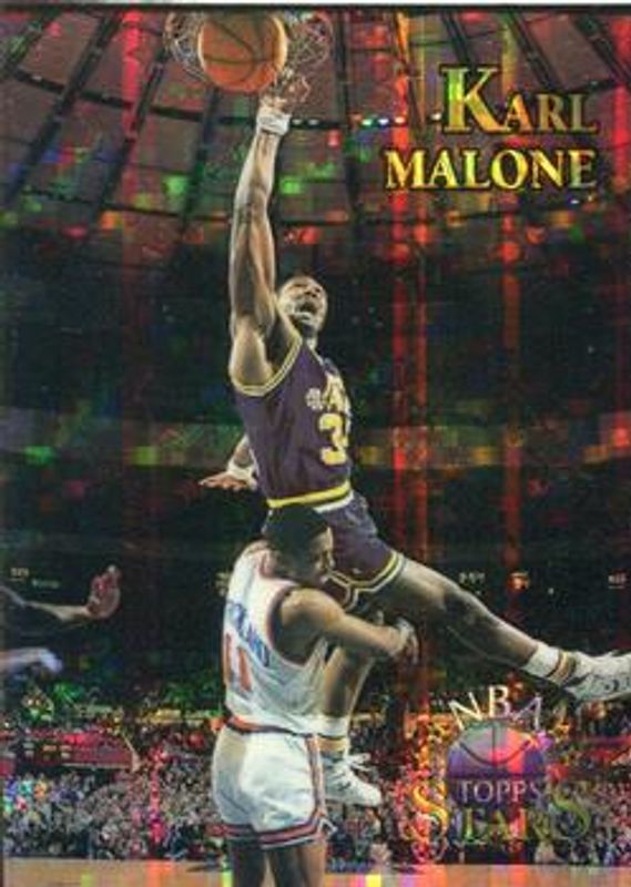 The Karl Malone 1996 Topps Stars #26 Finest Atomic Refractor card is 1 of 17 Karl Malone's card variations in the 1996 Topps Stars set being tracked by Sports Card Investor, including #26 Base, #76 Base, #126 Base, #126 Finest, and #26 Finest.