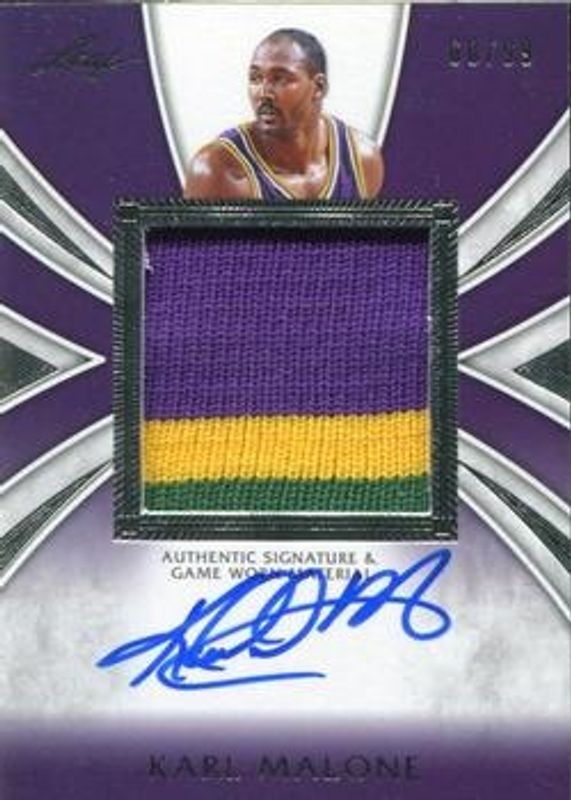 The Karl Malone 2012 Leaf Ultimate Draft #KM-1 Karl Malone Patch Autographs /99 card is 1 of 19 Karl Malone's card variations in the 2012 Leaf Ultimate Draft set being tracked by Sports Card Investor, including Base, Printing Plates Black, Printing Plates Cyan, Printing Plates Magenta, and Printing Plates Yellow.