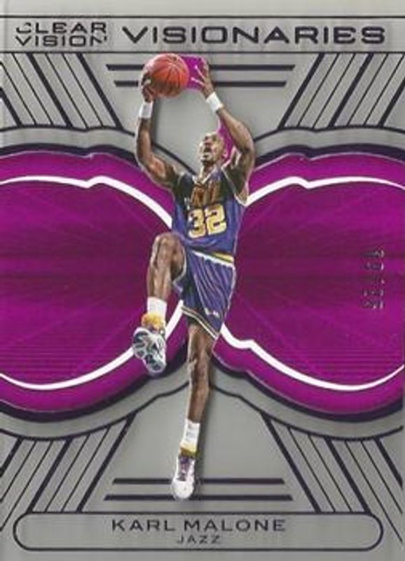 The Karl Malone 2015 Clear Vision #9 Visionaries - Purple /25 card is 1 of 8 Karl Malone's card variations in the 2015 Clear Vision set being tracked by Sports Card Investor, including Visionaries, Visionary Signatures - Inscriptions, Visionaries - Blue /149, Visionary Signatures /112, and Visionaries - Red /99.