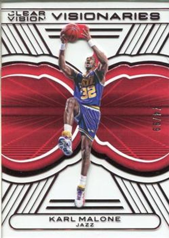 The Karl Malone 2015 Clear Vision #9 Visionaries - Red /99 card is 1 of 8 Karl Malone's card variations in the 2015 Clear Vision set being tracked by Sports Card Investor, including Visionaries, Visionary Signatures - Inscriptions, Visionaries - Blue /149, Visionary Signatures /112, and Visionaries - Purple /25.