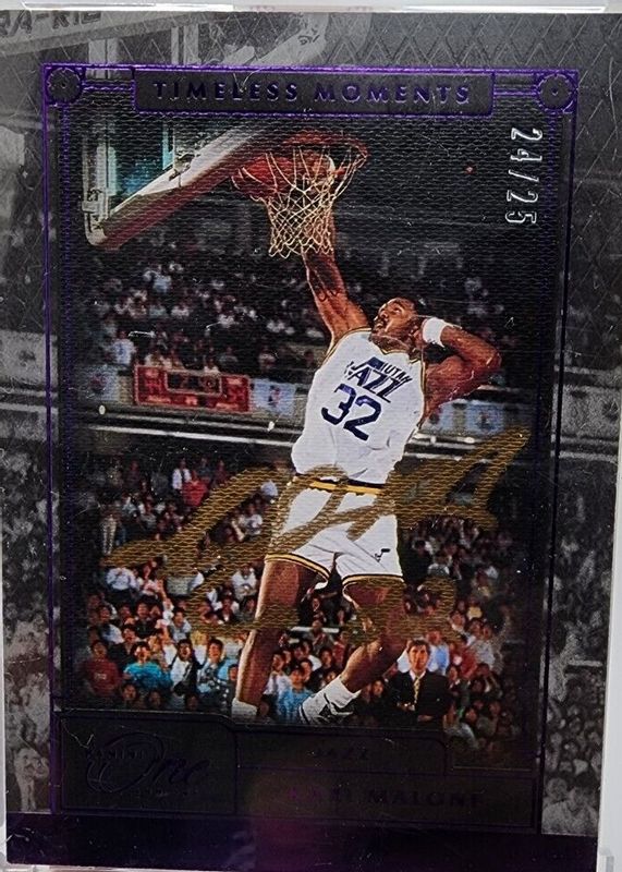 The Karl Malone 2020 One and One #TML-KML Timeless Moments Autographs - Purple (/25) card in Raw condition has not changed in price in the last 30 days and was last sold for $300.00 .
