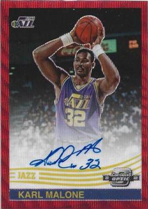The Karl Malone 2021 Contenders Optic #84-KML 1984 Tribute Autographs - Red Wave card is 1 of 17 Karl Malone's card variations in the 2021 Contenders Optic set being tracked by Sports Card Investor, including 1984 Tribute Autographs, Legendary Contenders Autographs /149, Legendary Contenders Autographs - Blue /75, 1984 Tribute Autographs - Red /35, and 1984 Tribute Autographs - Blue /25.