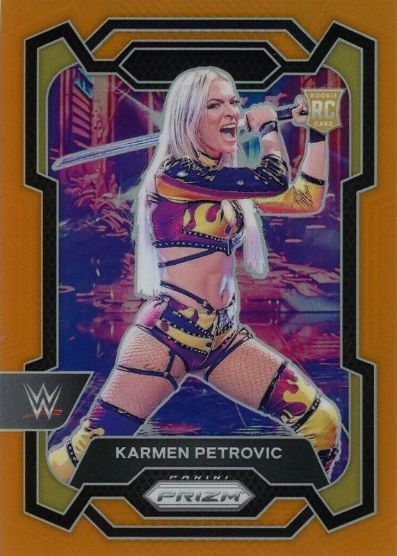 The Karmen Petrovic 2024 Prizm WWE #107 Orange /99 Rookie card in Raw condition has not changed in price in the last 30 days and was last sold for $11.50 .
