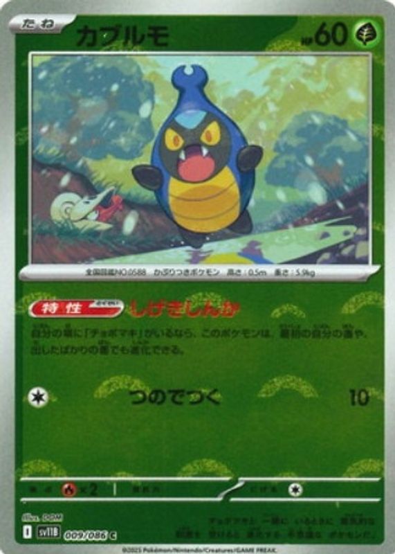 The Karrablast 2025 Japanese Scarlet & Violet: Black Bolt #009/086 Reverse Holo card in Raw TCG (Lightly Played) condition has not changed in price in the last 30 days and was last sold for $0.99 .