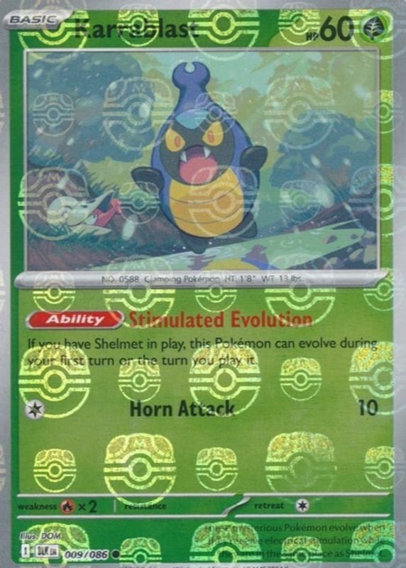 The Karrablast 2025 Scarlet & Violet: Black Bolt #009/086 Master Ball Reverse Holo card in Raw TCG (Near Mint) condition has moved down -$0.25 (-9.1%) in the last 30 days and was last sold for $2.50 .