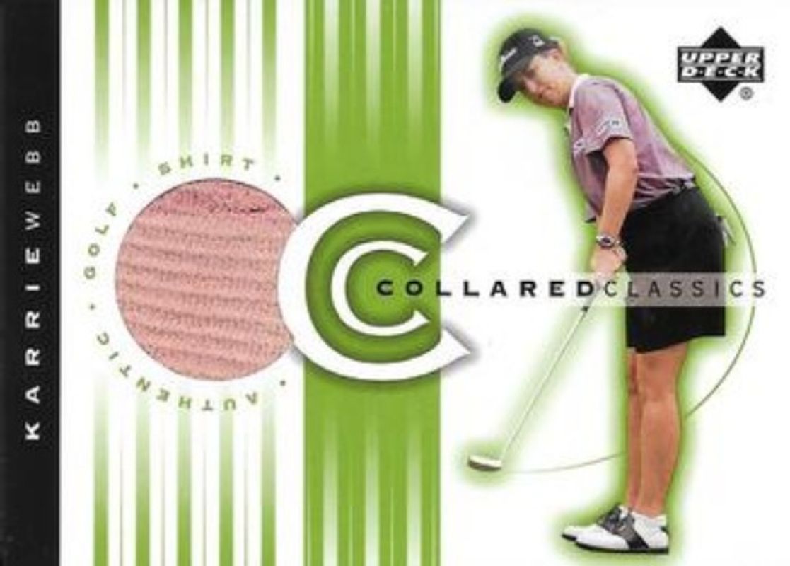 The Karrie Webb 2003 Upper Deck #CC-KW Collared Classics card is 1 of 6 Karrie Webb's card variations in the 2003 Upper Deck set being tracked by Sports Card Investor, including #51 Base, #GE-KW Golf Gear - Eagle, #MC-32 Major Champions, #MC-38 Major Champions, and #WP1-KW World Powers Single Shirts.