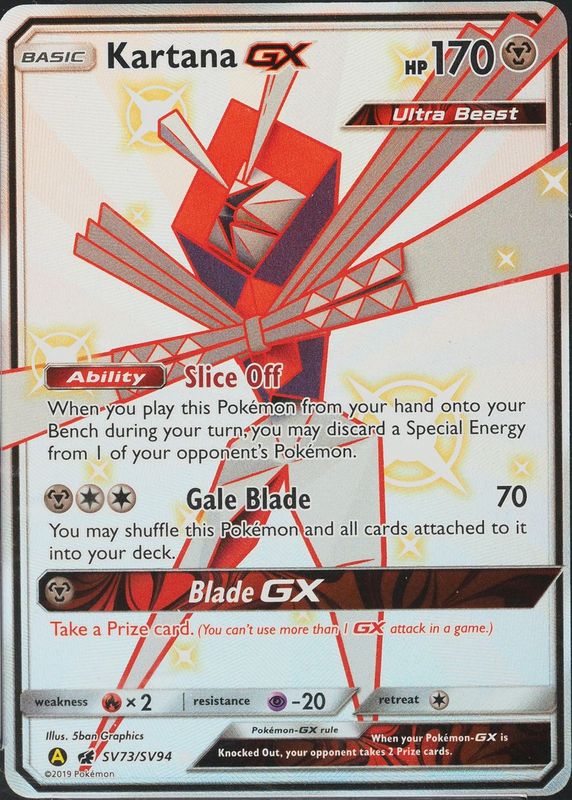 The Kartana GX 2019 Sun & Moon: Hidden Fates #SV73/SV94 Shiny Rare (Full Art) card in Raw TCG (Near Mint) condition has moved down -$0.44 (-5.9%) in the last 30 days and was last sold for $7.06 .
