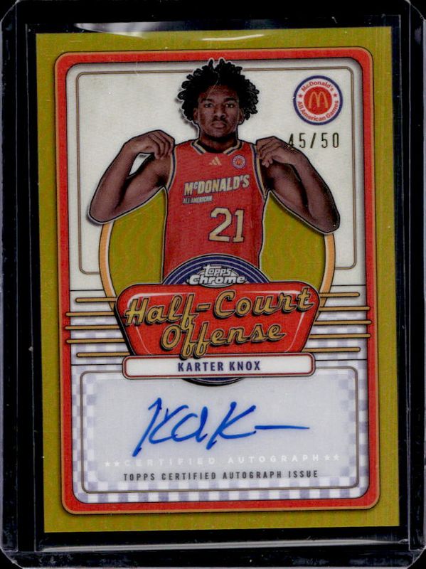 The Karter Knox 2024 Topps Chrome McDonald's All-American #IML-KAR Half-Court Signatures - Gold Refractor /50 card is 1 of 112 Karter Knox's card variations in the 2024 Topps Chrome McDonald's All-American set being tracked by Sports Card Investor, including #89 Base, #39 Base, #39 Blue RayWave Refractor, #89 Blue RayWave Refractor, and #39 McDonald's Logo Refractor.