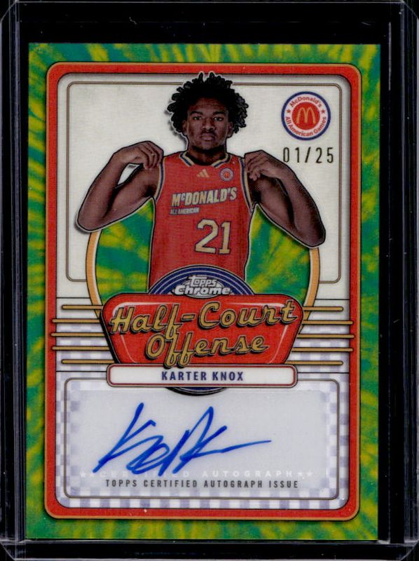 The Karter Knox 2024 Topps Chrome McDonald's All-American #IML-KAR Half-Court Signatures - Tie-Dye Refractor /25 card is 1 of 112 Karter Knox's card variations in the 2024 Topps Chrome McDonald's All-American set being tracked by Sports Card Investor, including #89 Base, #39 Base, #39 Blue RayWave Refractor, #89 Blue RayWave Refractor, and #39 McDonald's Logo Refractor.