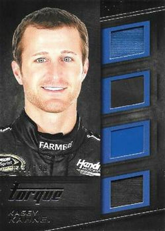 The Kasey Kahne 2016 Torque NASCAR #QM-KK Quad Materials /199 card is 1 of 118 Kasey Kahne's card variations in the 2016 Torque NASCAR set being tracked by Sports Card Investor, including #60 Base, #75 Base, #20 Base, #60 Gold, and #75 Gold.