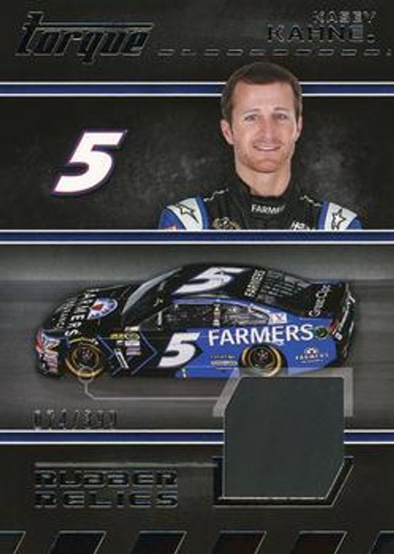 The Kasey Kahne 2016 Torque NASCAR #RR-KK Rubber Relics /399 card is 1 of 118 Kasey Kahne's card variations in the 2016 Torque NASCAR set being tracked by Sports Card Investor, including #60 Base, #75 Base, #20 Base, #60 Gold, and #75 Gold.