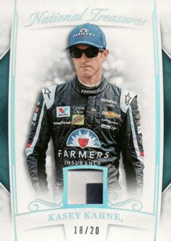 The Kasey Kahne 2017 National Treasures NASCAR #14 Century Holo Silver /20 card is 1 of 129 Kasey Kahne's card variations in the 2017 National Treasures NASCAR set being tracked by Sports Card Investor, including Base /25, Century Gold /15, Century Holo Gold /10, Century Green /5, and Century Black /1.