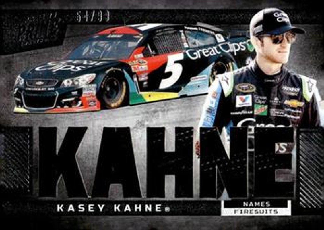 The Kasey Kahne 2023 Panini Prime #N-KKA Names Firesuits /99 card is 1 of 42 Kasey Kahne's card variations in the 2023 Panini Prime set being tracked by Sports Card Investor, including Base /49, Holo Gold /25, Holo Silver /10, Purple /5, and Holo Platinum Blue /1.