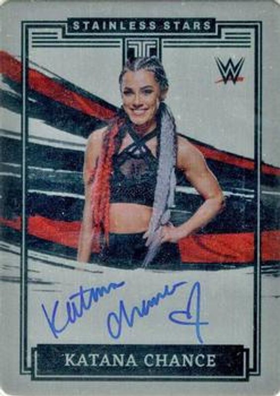 The Katana Chance 2022 Impeccable WWE #SS-KCZ Stainless Stars Autographs /99 card is 1 of 10 Katana Chance's card variations in the 2022 Impeccable WWE set being tracked by Sports Card Investor, including Indelible Ink /99, Stainless Stars Autographs - Blue /75, Stainless Stars Autographs - Purple /49, Indelible Ink - Holo Silver /25, and Stainless Stars Autographs - Orange /25.