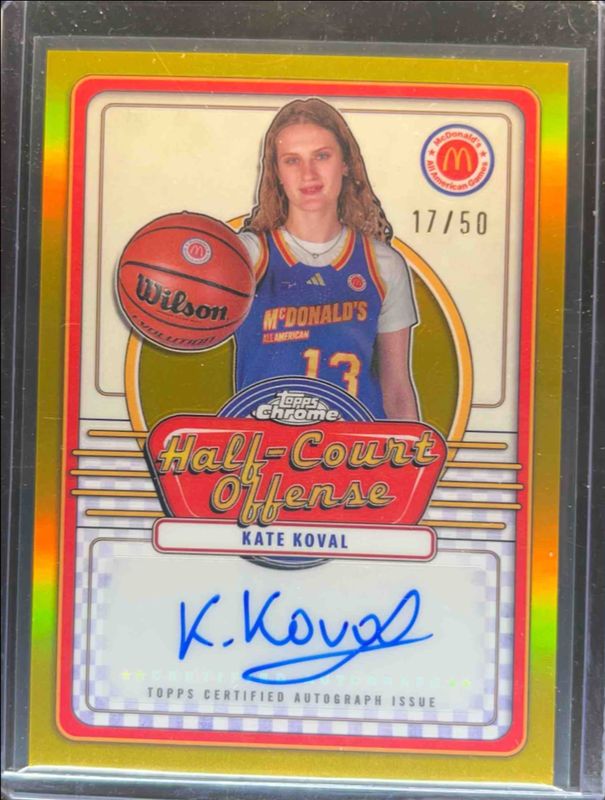 The Kate Koval 2024 Topps Chrome McDonald's All-American #IML-KAT Half-Court Signatures - Gold Refractor /50 card is 1 of 112 Kate Koval's card variations in the 2024 Topps Chrome McDonald's All-American set being tracked by Sports Card Investor, including #6 Base, #56 Base, #56 Blue RayWave Refractor, #6 Blue RayWave Refractor, and #56 McDonald's Logo Refractor.