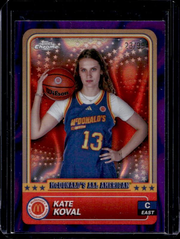 The Kate Koval 2024 Topps Chrome McDonald's All-American #56 Purple Lava Refractor /99 card is 1 of 112 Kate Koval's card variations in the 2024 Topps Chrome McDonald's All-American set being tracked by Sports Card Investor, including #6 Base, #56 Base, #56 Blue RayWave Refractor, #6 Blue RayWave Refractor, and #56 McDonald's Logo Refractor.