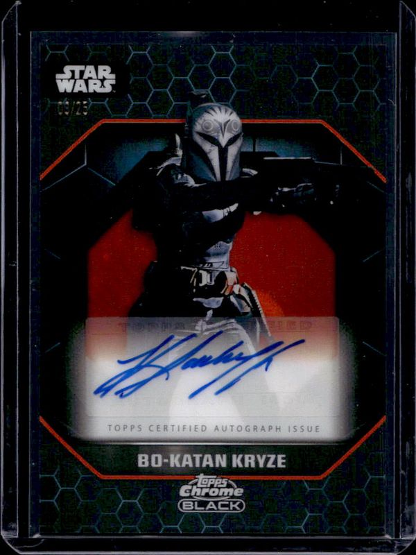 The Katee Sackhoff 2024 Topps Chrome Black Star Wars #ALS-KS Light Side Autographs - Orange Refractor /25 card is 1 of 17 Katee Sackhoff's card variations in the 2024 Topps Chrome Black Star Wars set being tracked by Sports Card Investor, including Duality of the Galaxy Autographs, Light Side Autographs, Duality of the Galaxy Autographs - Blue Red Lava Refractor /99, Light Side Autographs - Blue Red Lava Refractor /99, and Duality of the Galaxy Autographs - Gold Refractor /50.
