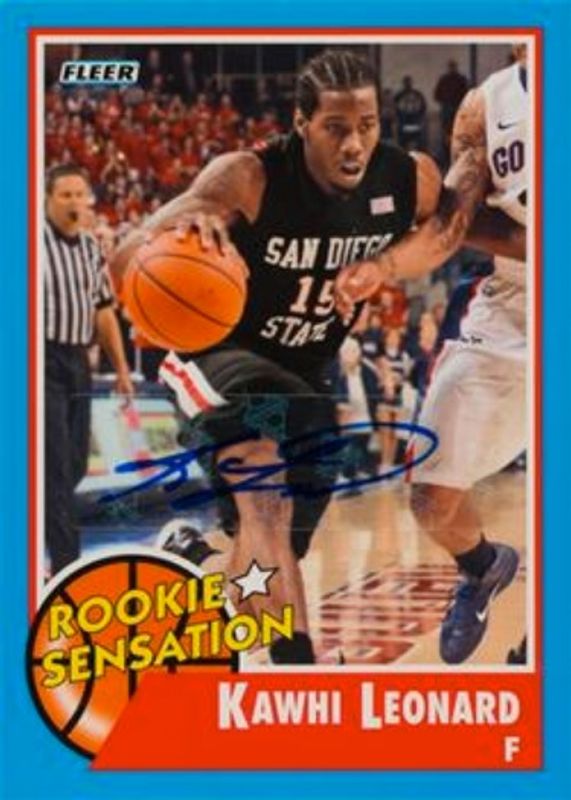 The Kawhi Leonard 2011 Fleer Retro #59 Autographs Rookie card is 1 of 10 Kawhi Leonard's card variations in the 2011 Fleer Retro set being tracked by Sports Card Investor, including Base, Rookie Sensations, 1988-89 Design, 1988 Autographs, and Intimidation Nation.