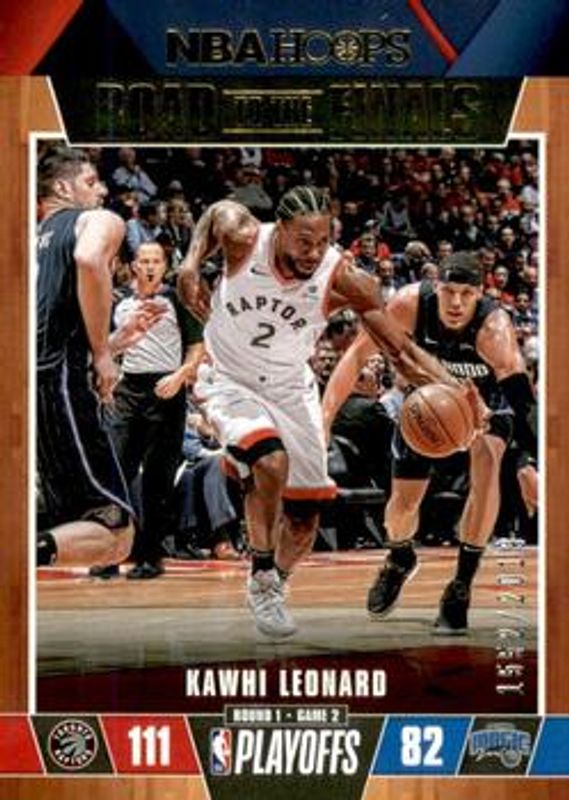The Kawhi Leonard 2019 Hoops #11 Road to the Finals /2019 card is 1 of 47 Kawhi Leonard's card variations in the 2019 Hoops set being tracked by Sports Card Investor, including Base, Premium Box Set /199, Black Artist's Proof /1, Action Shots, and Back Stage Pass.