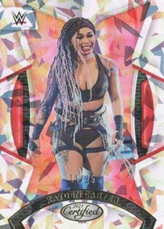 The Kayden Carter 2023 Chronicles WWE #212 Cracked Ice /25 card is 1 of 13 Kayden Carter's card variations in the 2023 Chronicles WWE set being tracked by Sports Card Investor, including Base, Bronze, Pink /199, Red /199, and Blue /99.
