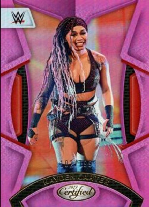 The Kayden Carter 2023 Chronicles WWE #212 Pink /199 card is 1 of 13 Kayden Carter's card variations in the 2023 Chronicles WWE set being tracked by Sports Card Investor, including Base, Bronze, Red /199, Blue /99, and Green /75.