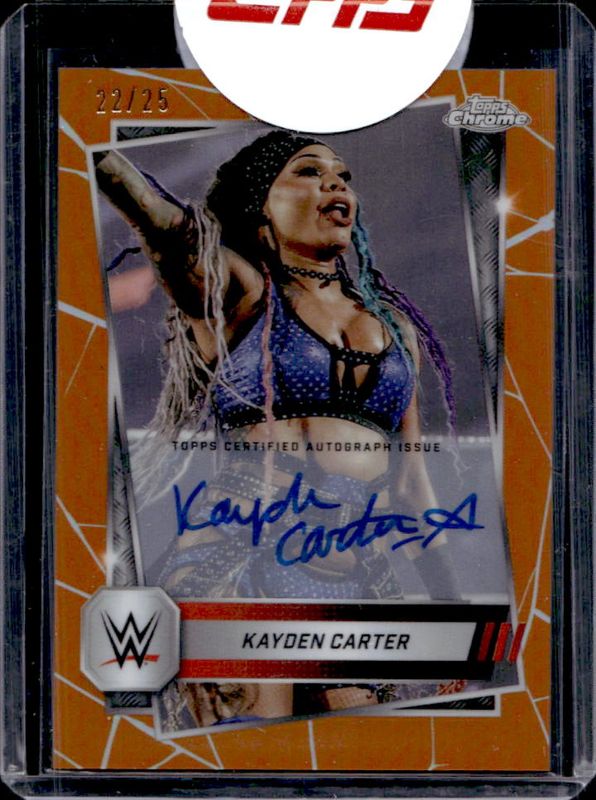 The Kayden Carter 2025 Topps Chrome WWE #CLA-KY Autographs - Orange Refractor /25 card is 1 of 50 Kayden Carter's card variations in the 2025 Topps Chrome WWE set being tracked by Sports Card Investor, including Base, Black & Gold Refractor, Geometric Refractor, Neon Green & Black Refractor, and Pink Shimmer Refractor.