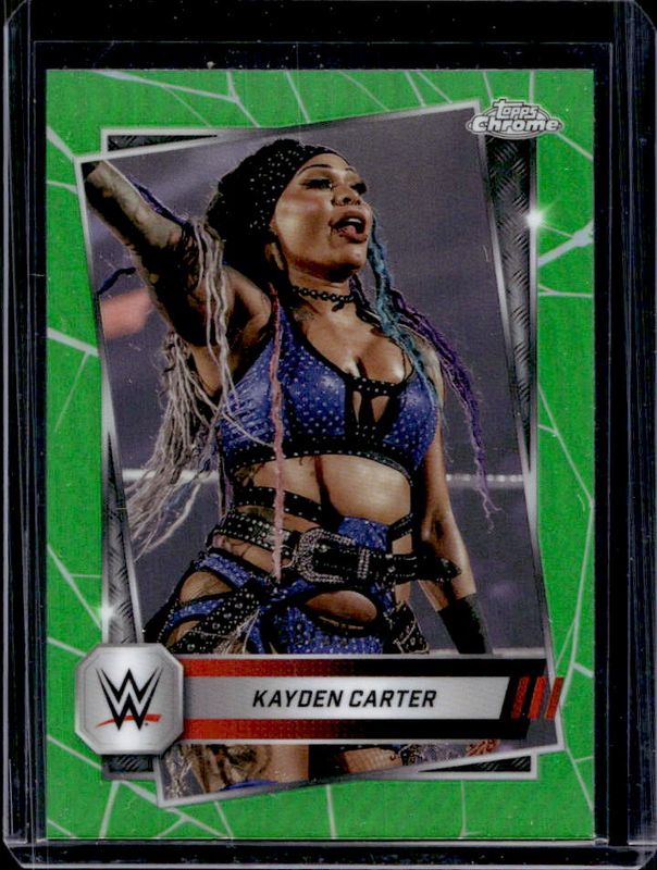 The Kayden Carter 2025 Topps Chrome WWE #186 Green Refractor /99 card is 1 of 50 Kayden Carter's card variations in the 2025 Topps Chrome WWE set being tracked by Sports Card Investor, including Base, Black & Gold Refractor, Geometric Refractor, Neon Green & Black Refractor, and Pink Shimmer Refractor.