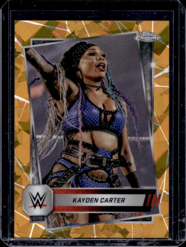 The Kayden Carter 2025 Topps Chrome WWE Sapphire Edition #186 Base Chrome - Gold Refractor /50 card is 1 of 11 Kayden Carter's card variations in the 2025 Topps Chrome WWE Sapphire Edition set being tracked by Sports Card Investor, including Base Chrome, Red Brand Autographs, Base Chrome - Green Refractor /75, Base Chrome - Orange Refractor /25, and Red Brand Autographs - Orange Refractor /25.