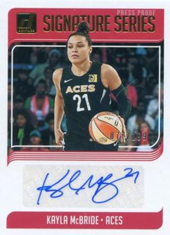The Kayla McBride 2019 Donruss WNBA #SS-KMB Signatures Series - Press Proof /199 card is 1 of 19 Kayla McBride's card variations in the 2019 Donruss WNBA set being tracked by Sports Card Investor, including Base, Optic, Optic Holo, Silver Press Proof /199, and Purple Press Proof /99.