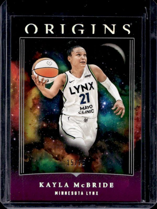 The Kayla McBride 2024 Origins WNBA #56 Purple /25 card is 1 of 8 Kayla McBride's card variations in the 2024 Origins WNBA set being tracked by Sports Card Investor, including Base, Red /99, Blue /75, Swirl /(SSP), and Teal /49.