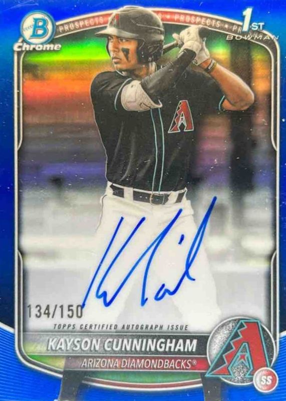 The Kayson Cunningham 2025 Bowman Draft #CPA-KC Chrome Prospect Auto - Blue Refractor /150 (1st) card in Raw condition has moved down -$50.49 (-18.4%) in the last 30 days and was last sold for $224.50 .