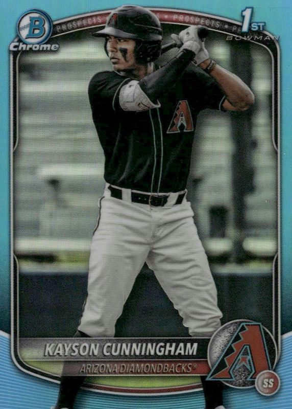 The Kayson Cunningham 2025 Bowman Draft #BDC-84 Chrome - Sky Blue Refractor (1st) card in Raw condition has moved down -$1.23 (-28.9%) in the last 30 days and was last sold for $3.02 .