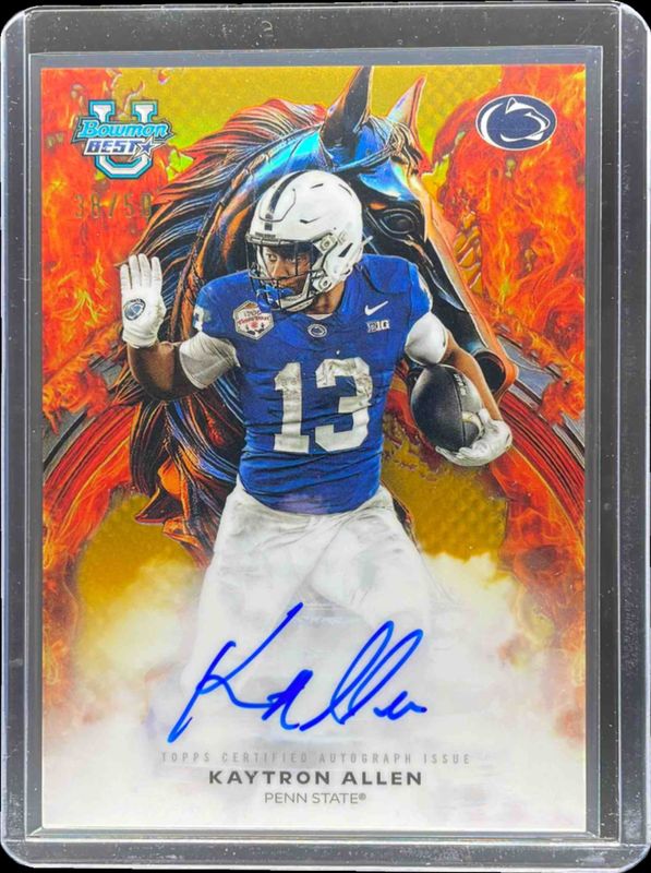 The Kaytron Allen 2025 Bowman's Best #WA-KA Workhorse Autographs - Gold Refractor /50 card is 1 of 61 Kaytron Allen's card variations in the 2025 Bowman's Best set being tracked by Sports Card Investor, including Base, Refractor, Shimmer Refractor, Yellow Lazer Refractor /250, and Aqua Lava Refractor /199.