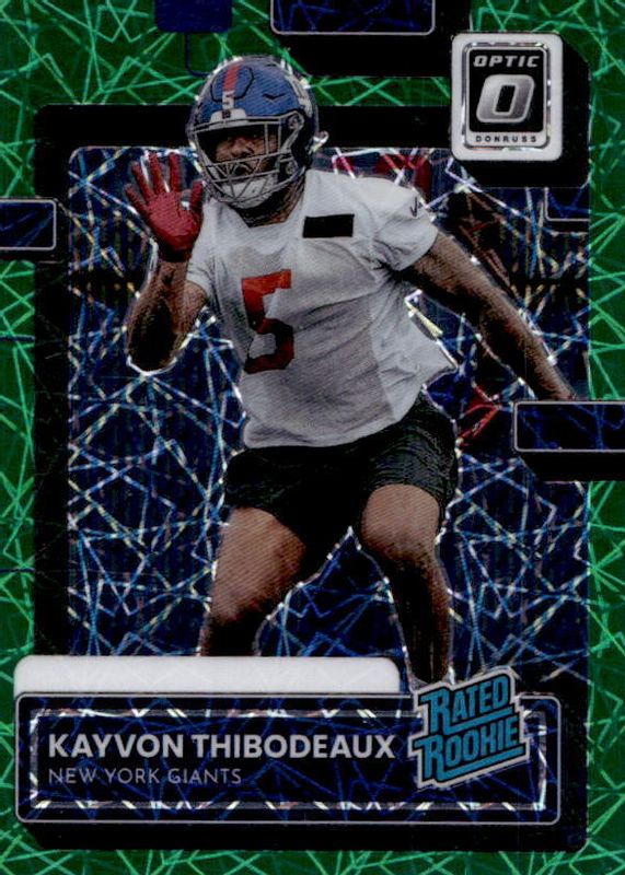 The Kayvon Thibodeaux 2022 Donruss #P-352 Optic Preview - Green Velocity Rookie card in Raw condition has not changed in price in the last 30 days and was last sold for $12.34 .
