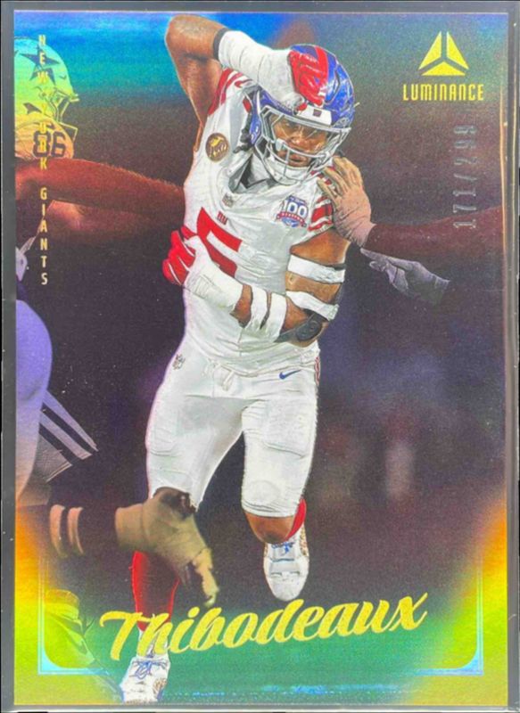 The Kayvon Thibodeaux 2025 Luminance #64 Gold /299 card is 1 of 14 Kayvon Thibodeaux's card variations in the 2025 Luminance set being tracked by Sports Card Investor, including Base, Purple /249, Blue /199, Green /100, and Black /75.
