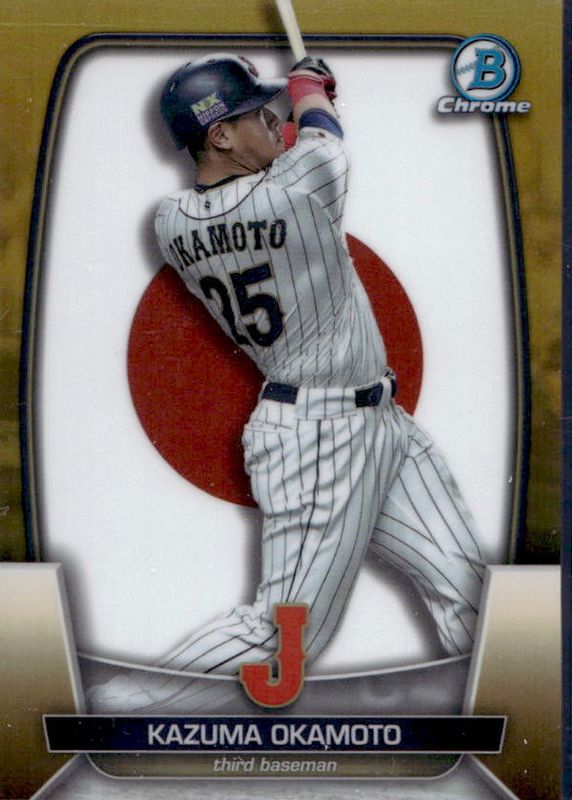 This card is 1 of 7 Kazuma Okamoto's card variations in the 2023 Bowman Chrome set being tracked by Sports Card Investor, including WBC Flag - Refractor /499, WBC Flag - Green Refractor /99, WBC Flag - Blue Refractor /75, WBC Flag - Orange Refractor /25, and WBC Flag - Red Refractor /5.