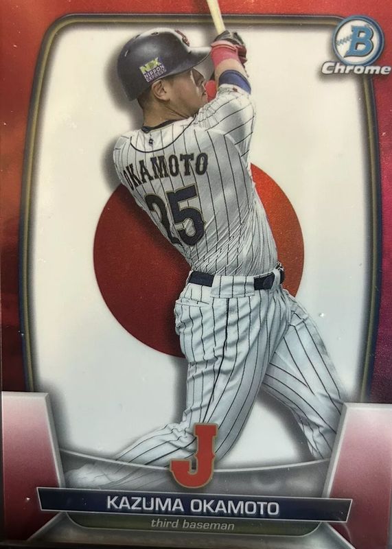This card is 1 of 7 Kazuma Okamoto's card variations in the 2023 Bowman Chrome set being tracked by Sports Card Investor, including WBC Flag - Refractor /499, WBC Flag - Green Refractor /99, WBC Flag - Blue Refractor /75, WBC Flag - Gold Refractor /50, and WBC Flag - Orange Refractor /25.