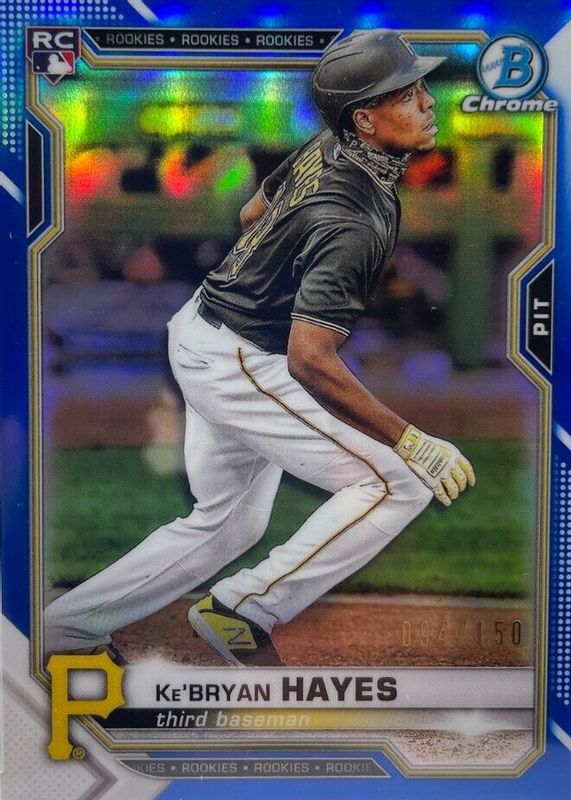 The Ke'Bryan Hayes 2021 Bowman Chrome #29 Blue Refractor /150 Rookie card in Raw condition has not changed in price in the last 30 days and was last sold for $5.00 .