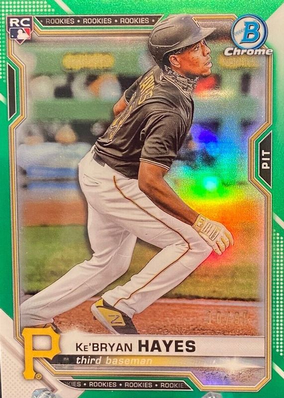 The Ke'Bryan Hayes 2021 Bowman Chrome #29 Green Refractor /99 Rookie card in Raw condition has not changed in price in the last 30 days and was last sold for $3.99 .