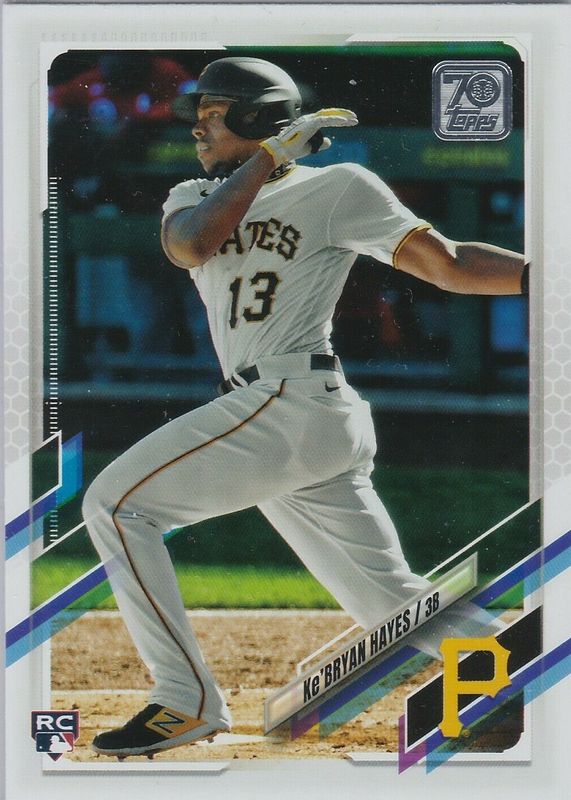 This card is 1 of 16 Ke'Bryan Hayes' card variations in the 2021 Topps set being tracked by Sports Card Investor, including Base, Gold Foil, Rainbow Foil, Gold /2021, and Green Foil /499.