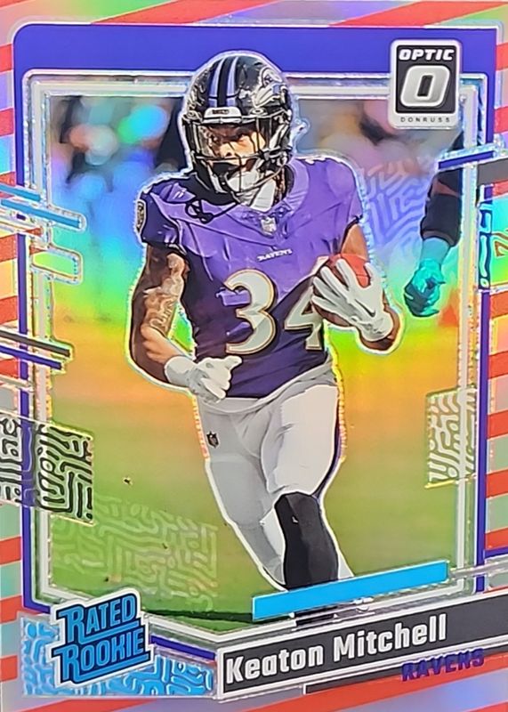 The Keaton Mitchell 2023 Optic #207 Freedom /(SSP) Rookie card in Raw condition has not changed in price in the last 30 days and was last sold for $9.99 .