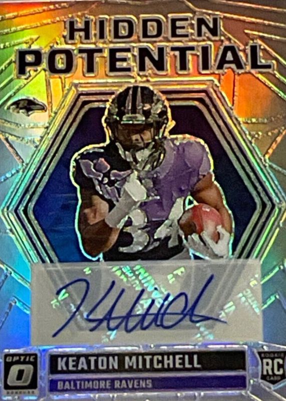 The Keaton Mitchell 2023 Optic #HP-KM Hidden Potential Autographs (/99) Rookie card in Raw condition has moved down -$4.99 (-25.0%) in the last 30 days and was last sold for $15.00 .
