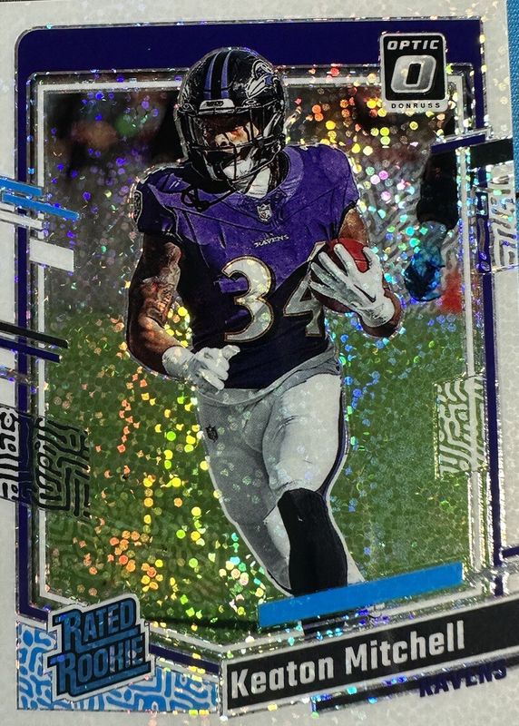 This card is 1 of 57 Keaton Mitchell's card variations in the 2023 Optic set being tracked by Sports Card Investor, including Base, Blue Hyper, Blue Scope, Green Hyper, and Green Velocity.