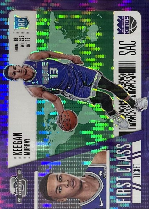 The Keegan Murray 2022 Contenders Optic #8 First Class Ticket - Green Pulsar /25 Rookie card in Raw condition has not changed in price in the last 30 days and was last sold for $15.00 .