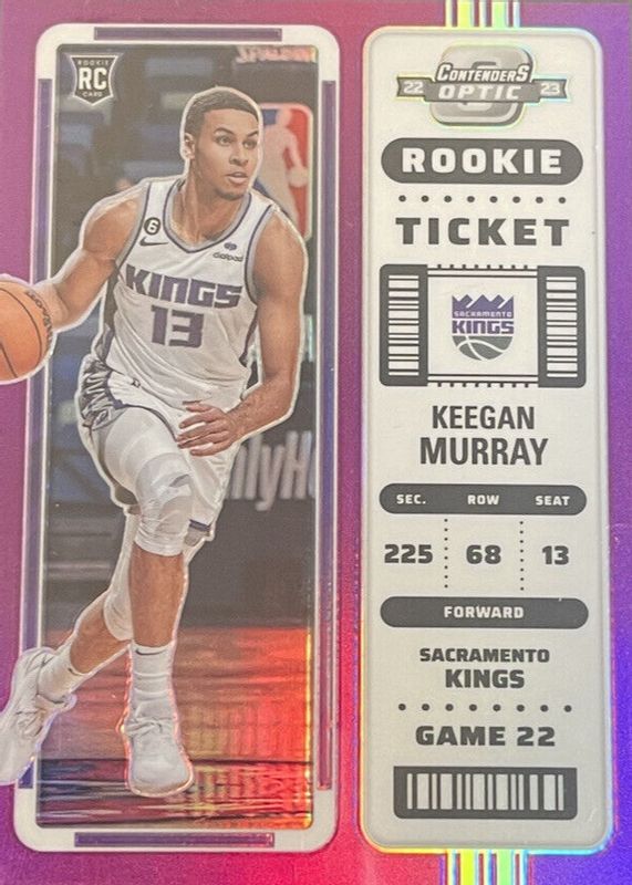 The Keegan Murray 2022 Contenders Optic #22 Purple /15 Rookie card in Raw condition has not changed in price in the last 30 days and was last sold for $16.50 .