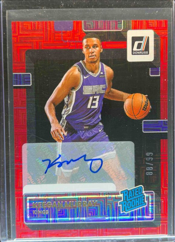 The Keegan Murray 2022 Donruss #204 Rated Rookie Signatures - Choice Red /99 card is 1 of 55 Keegan Murray's card variations in the 2022 Donruss set being tracked by Sports Card Investor, including Base, Choice, Holo Green Laser, Holo Red & Gold Laser, and Press Proof Silver.